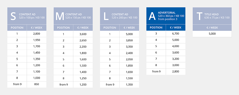 The advertorial prices apply to the word/image advert. Booking is possible from position 3. You can find an example in position 7 here.