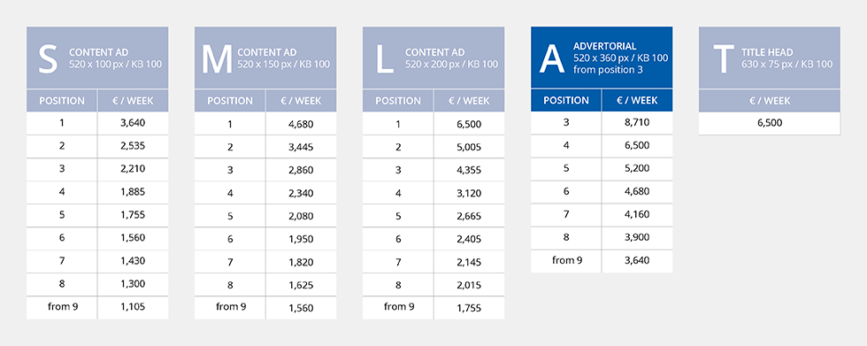With a format of 520x360px, an advertorial is the largest bookable advertising format in our newsletter. Your advertising placement differs from the editorial content due to the design, but is embedded in the middle of it. The positions can be booked from position 3.