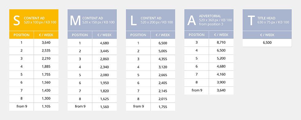 With its 520x100px format, the Content Ad S is the smallest bookable advertising format in our newsletter. You can reach a large target group with a small budget.